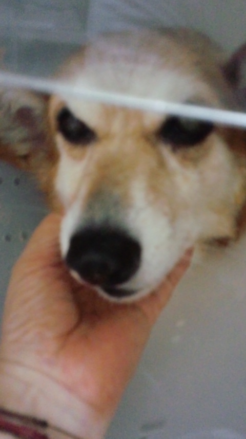頭部はエリザベスカラーで濡れないので身体にタオルをかけて移動しました^^